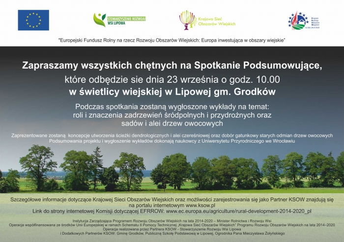 Zapraszamy do Lipowej na Spotkanie podsumowujące realizacje operacji KSOW pt. Ekosystemy terenów wiejskich - identyfikacja i znaczenie dla środowiska lokalnego. Szczegóły na plakacie.
